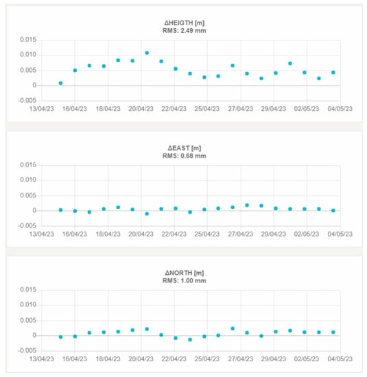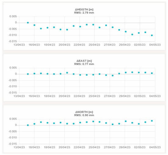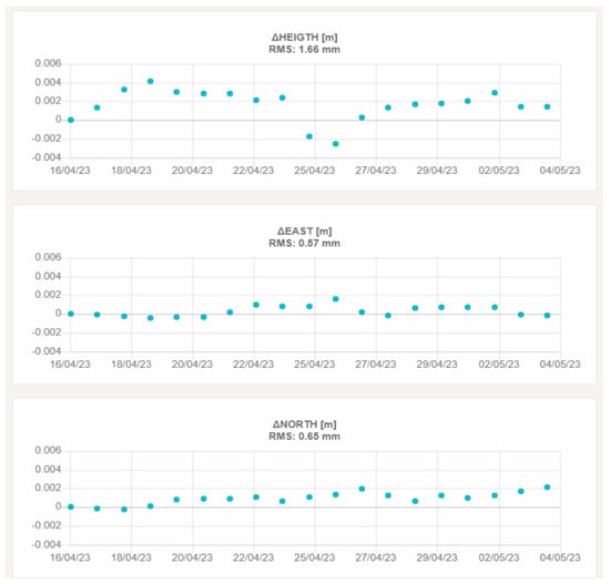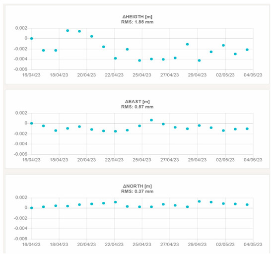 - It computes the accurate and precise antenna phase center displacement in the last period. Such a computation is based on a static-differential approach working with double differenced carrier phases observables [,]. The computation is realized exploiting an upgraded version of the DISPLAYCE software tool developed by YetItMoves []. The development activity carried out in the framework of the GREAT project and in the previous H2020 TURNkey project [] allowed to extend the functionalities of the original DISPLAYCE software described in [] and initially meant to work with single frequency data, introducing the software routines required to handle multi-frequency GNSS observables, thus allowing to manage regional scale baselines up to 200–300 Km. The most important features added to the computation software include: