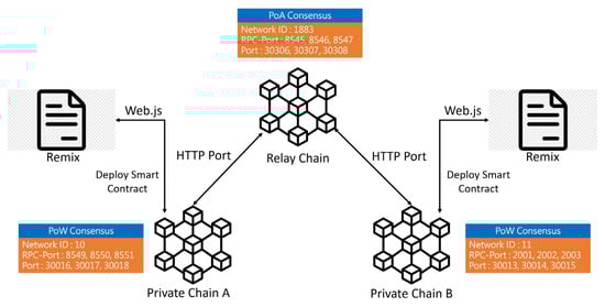The network structure of our scheme is depicted in Figure 3. To simulate cross-blockchain interoperation, we constructed three blockchains, with each blockchain consisting of three nodes. Internal consensus protocols were implemented for proof-of-work (PoW) in the sub-chains and proof-of-authority (PoA) in the relay chain. The prototype cross-blockchain system was realized using Geth and Puppeth. The hardware resources utilized in our implementation included AMD Ryzen 5 5600X CPU, 32 GB DDR4 RAM, and 1 TB SATA Hard Drive. The software platforms employed were Windows 10, Remix, Solidity, Web3j CLI, Eclipse 3.8, Geth, and Puppeth. In summary, our prototype cross-blockchain system was implemented on a robust hardware and software platform, with the use of widely adopted tools and technologies in the blockchain field, to enable a realistic simulation of cross-blockchain interoperation.