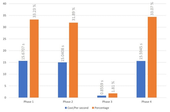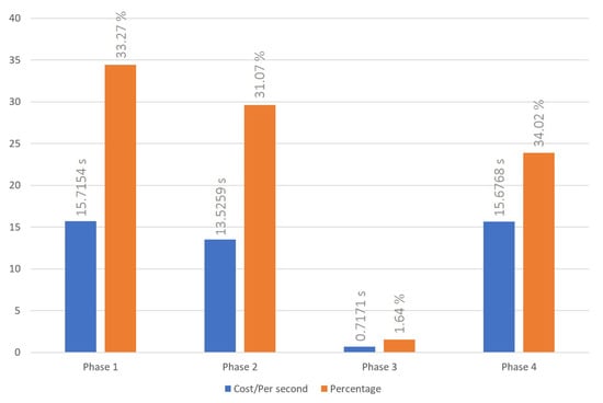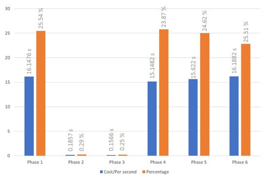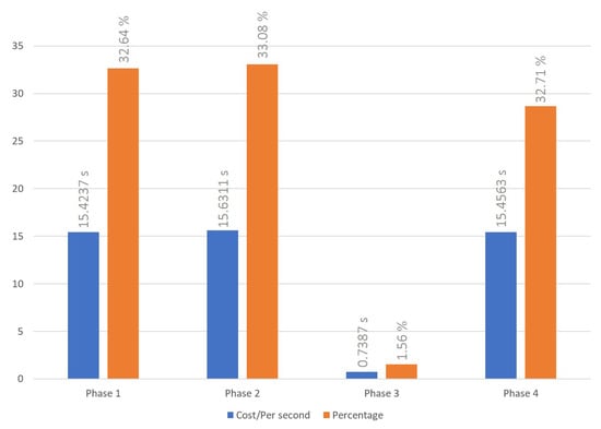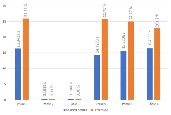 The cross-chain interoperation process was conducted following the procedures outlined in Section 3.1. The time cost to successfully complete a transaction has been recorded for three, six, and nine node settings, and are shown in Figure 4, Figure 5 and Figure 6, respectively. The average times of the cross-chain interoperability process for different numbers of nodes were presented in Figure 7. The experimental results show that cross-chain interoperation process in our scheme requires 63.4484 s, on average of 10 times. In the process of cross-chain interoperation, transaction nodes make reputation evaluate whenever a transaction passes through themselves, and this reputation is based on the past transaction results and behaviors of nodes. Through phases 2 and 3, we found that when nodes assess each indicator reputation value of other nodes and chains, the average time consumed is much less than other phases. Notably, the evaluation is carried out only by the information receiving node towards the information transmitting node. Consequently, the quantity of nodes does not significantly affect the system, maintaining its efficiency irrespective of the node count.