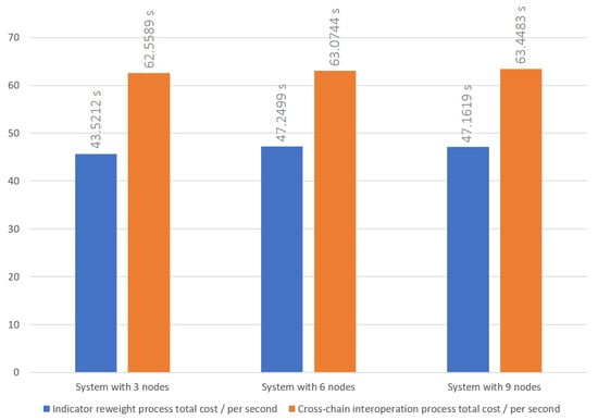 Time cost of cross-blockchain interoperation process and indicator reweight process with 3 to 9 nodes system.