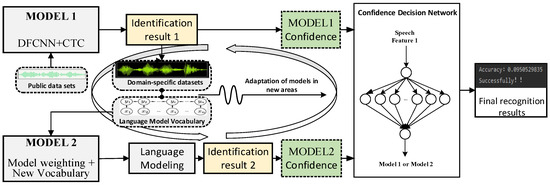 In this paper, we propose a speech recognition method based on the architecture of DSL-Net and CD-Net. As shown in Figure 1, Model 1, in this case, first utilized a domain-specific public dataset and automatically trained the dataset through DSL-Net. Then, the domain-specific speech model was trained on the pre-trained model parameters through MODEL 2 migration learning. Based on this, an integrated learning approach was used to combine the domain-specific speech models with the speech models trained from the benchmark dataset, thereby improving the recognition accuracy. The method adapts to the input speech by automatically expanding the lexical content in the ASR model and dynamically adjusting the use of the language model based on speech confidence to enhance the accuracy of the speech recognition model. Due to the complexity of the speech signal and the multifaceted influence of the language model, optimizing whether the trained language model should be activated in certain situations becomes crucial. To address this, we introduced a speech confidence-based decision layer to the last layer of the convolutional neural network. Using the two-channel confidence as input, the decision network is obtained through model training, and the decision layer determines whether the current audio utilizes the trained language model or not. Additionally, the method automatically increases the lexicon content of the ASR model using a lexicon and language model and employs accuracy as an evaluation metric to enhance speech recognition accuracy by optimizing the usage of the language model.