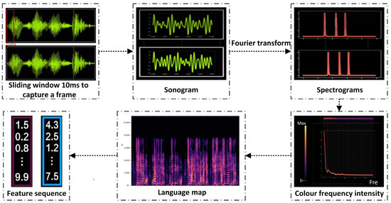 In this paper, an acoustic modeling approach based on DFCNN and CTC is proposed. DFCNN is an innovative speech recognition framework proposed by KDDI in 2016, which has gained attention in current acoustic modeling research. In this paper, the DFCNN framework is adopted and combined with the CTC technique to model whole-sentence speech. This model design allows the output units to directly correspond to the final recognition results, resulting in more accurate and precise speech recognition. The process of constructing the acoustic model in a speech recognition system involves several steps. Firstly, the time-domain speech signal is transformed into a speech spectrogram through operations such as framing, windowing, Fourier transform, and logarithmic scaling. Figure 2 illustrates the process of converting audio into speech spectrogram feature sequences. In the speech spectrogram, the x-axis represents time, the y-axis represents frequency, and the intensity of the colors reflects the amplitude, with brighter colors indicating higher amplitude and darker colors indicating lower amplitude. The speech spectrogram captures the energy distribution information across different frequency bands, which serves as a foundation for subsequent feature extraction and model development.