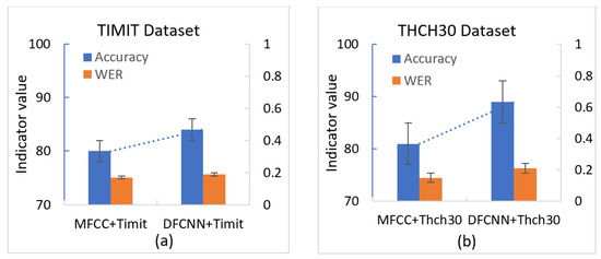 Comparing the mainstream speech recognition experiments and the results based on speech spectrograms in Figure 6, (a) for the validation of the results on the dataset Timit; (b) for the validation of the results on the dataset Thch30; the following conclusions can be drawn. The mainstream MFCC methods demonstrate a certain level of recognition ability in speech recognition, but they are weak when it comes to handling long-duration sequence data and location sensitivity. On the other hand, the methods based on speech spectrogram, DFCNN, and CTC exhibit better performance in terms of characterizing speech signals, retaining temporal sequence information, and capturing spectral information compared to the mainstream MFCC methods. As a result, these methods can achieve more accurate speech recognition. Moreover, these methods also exhibit stronger robustness and perform better in the presence of interference factors such as background noise and slurred speech.