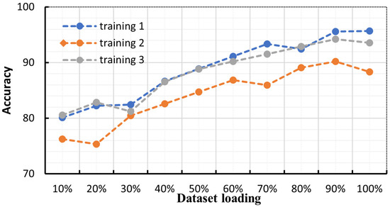 To further investigate the impact of domain-specific datasets on proprietary domains within this approach, various sizes of loaded feature sets were utilized to validate the model’s recognition effectiveness. As depicted in Figure 7, it is evident that the accuracy of speech recognition gradually improves with an increase in the loading of the feature set. Although the validation set for each iteration is randomized and the dataset may undergo perturbations, resulting in a decrease in accuracy for certain segments, the overall accuracy shows an upward trend. This suggests that the overall efficacy of the method remains unaffected by domain specificity and that the accuracy of speech recognition can be further enhanced by augmenting the size of the domain-specific dataset.