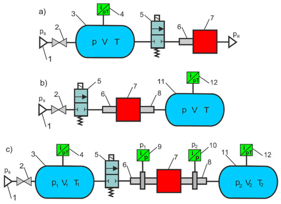 Indirect flow measurements are usually less expensive and less complicated than direct flow measurements. Indirect flow measurements do not require the use of mass flow meters or high-efficiency compressors. The following tests are used for indirect flow measurements: simple discharge test, vacuum charge test, isothermal discharge test, charge test, discharge test, and tank-to-tank test. The schematic diagrams of the test bench for the indirect measurement of the flow characteristics and parameters of the pneumatic components are shown in