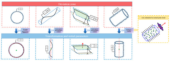 The deviation-zone evaluation process solves Equation (2) by continuously optimizing the fitting parameter, U, to minimize the objective function. Obviously, diverse geometries have different expressions and distance functions, and the number of parameters to be optimized varies. In the following, these surfaces will be individually discussed.