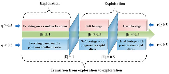 where E indicates the remaining energy of the rabbit in the escape process, T denotes the maximum number of iterations, and E 0 is the initial state of its energy generated randomly inside the interval (−1, 1) in each iteration. Thus, if | E | 1 , this means that the rabbit has enough energy to escape, so the HHO will perform diverse exploration operations, and if | E | < 1 , the rabbit is weak, so the algorithm will try to exploit the neighborhood of the solutions.