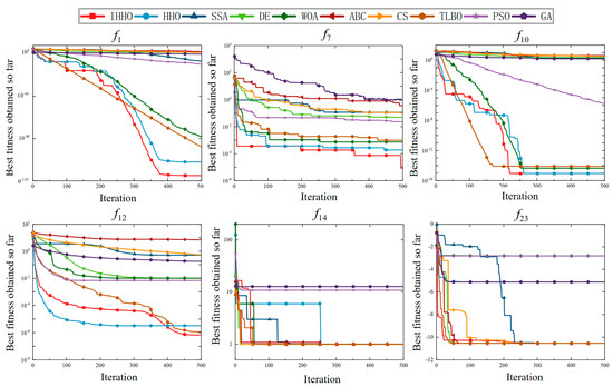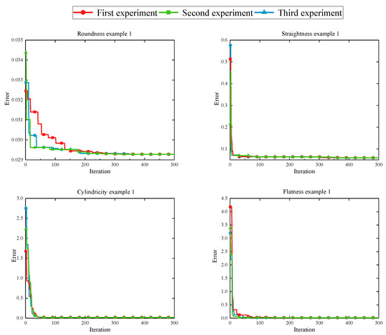 To evaluate the availability of IHHO in form deviation-zone evaluation, we benchmarked the proposed IHHO by reference to data in the literature. The flowchart of IHHO applied to solve the deviation-zone evaluation problem is shown in Figure 8. The population size was set to 30, the maximum number of iterations was 500, and the optimization dimension and search area for the corresponding problem were shown in Section 2.1. The algorithm was run 30 times independently using MATLAB2016a software, and the average result was taken as the corresponding form error. Table 7 shows the evaluation results of the algorithms reported in the literature and those obtained by IHHO. The results list the number of points, reported minimum-zone errors, IHHO evaluation minimum-zone errors, least-squares evaluation errors, and relative differences. In addition, the convergence curves of three randomly selected experiments are shown in Figure 9 to visualize the working process of the IHHO algorithm for deviation-zone evaluation.