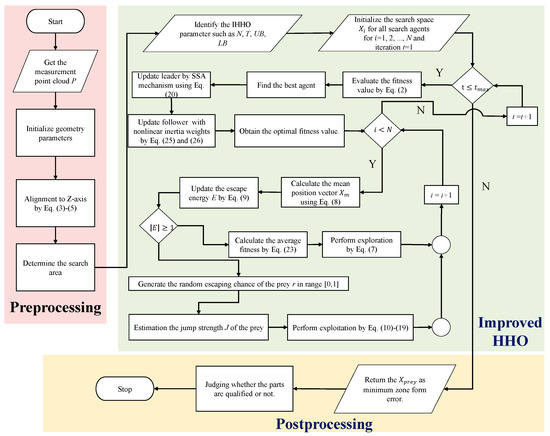In this paper, an improved HHO algorithm (IHHO) is proposed for solving the form deviation-zone evaluation problem. The IHHO focuses on two areas of improvement: exploration strategy selection and exploration capabilities. The latter was mainly inspired by [39]. Furthermore, the search area of the primitive geometries is analyzed to speed up the convergence.