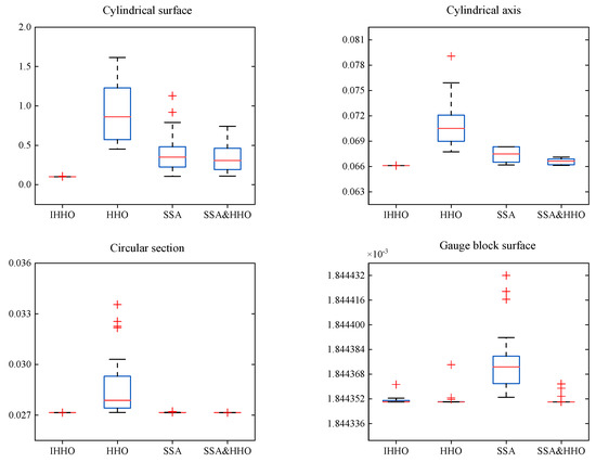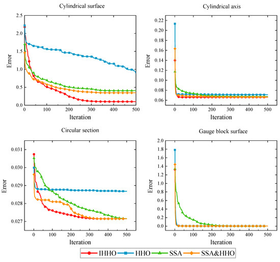 Based on the deviation-zone model developed in Section 2.1, the above acquisition data were evaluated using the IHHO, HHO, SSA, SSA&HHO [34], and least-squares methods. To thoroughly verify the convergence property of the algorithm, the maximum number of iterations T = 500 and N = 30. The experiments were repeated 30 times for each data group to remove accidental errors. The results are summarized in Table 8. The boxplots and average convergence curves for the different algorithms relative to the number of iterations are plotted in Figure 11 and Figure 12. The error maps of the gauge block surface and the seamless tube surface are shown in Figure 13.