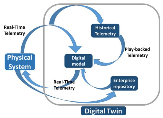 Under these conditions, the traditional conceptual model of DT comprises four major components: the digital model, the enterprise repository, the factory telemetry, and the digital thread (Figure 1) [36]. The first component is an abstract characterization of the asset with all its parts and logical relations existing between parts, and it also contains a description of its behavior. The second component is the enterprise repository, a database that contains all the information concerning the management of the organization’s resources. The third component is the factory telemetry, which allows for the continuous bidirectional synchronization between the physical artifact and its digital counterpart, i.e., a constant mirroring of the two sides thanks to two opposite streams of data in motion.