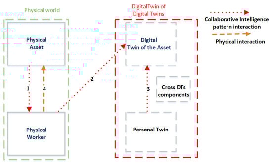 In this section, the impact of the CI concept on the traditional DT model is discussed. In this regard, the study investigates the new blocks that must be introduced within the DT conceptual model and the CI interactions that involve these blocks. These blocks and interactions are illustrated in Figure 2. In particular, the figure introduces, next to the blocks of physical assets and their DTs, the blocks corresponding to physical workers and their corresponding personal twins (PTs). PTs are in turn combined and integrated with all the other DTs in a federation of DTs, creating the conditions to realize a DT of DTs (red hatched rectangle in Figure 2 and Figure 3).