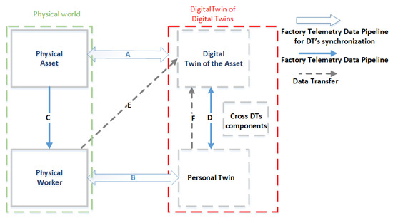 In particular, the bidirectional arrow A corresponds to the factory telemetry component of the traditional model of DT as described in Section 2.2.2. Thus, arrow A represents the process of synchronization between the physical asset and its DT (DTA), while the bidirectional arrow B represents a new telemetry stream that enables synchronization between new blocks of the physical worker and its digital personal twin.