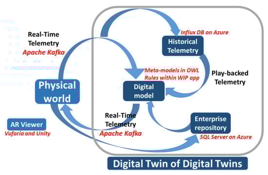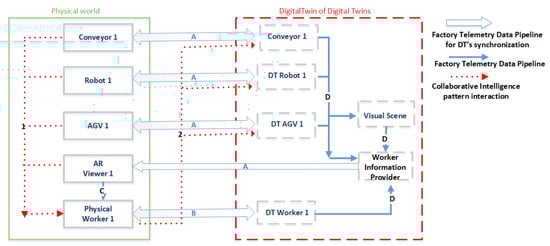 In addition, the visual interaction of the worker, which allows for the demonstration of information from the DTA to the worker (e.g., through an AR viewer, a monitor, or another physical device), implies a connection between the physical system and the physical worker (the unidirectional arrow C).