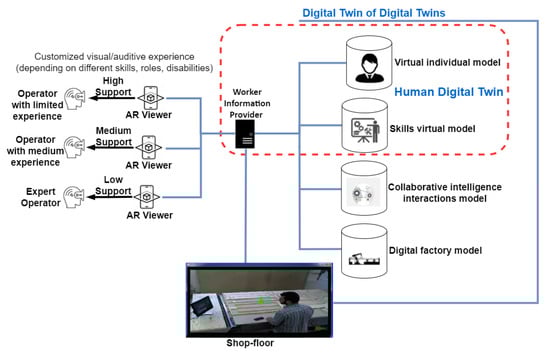 - In the proposed model, there is no link between the DTA and the physical worker. Indeed, the information included within the DTA must be conveyed to the physical worker through a physical device (such as an AR viewer), by exploiting the data pipeline represented by arrow C in Figure 3.