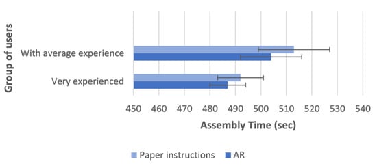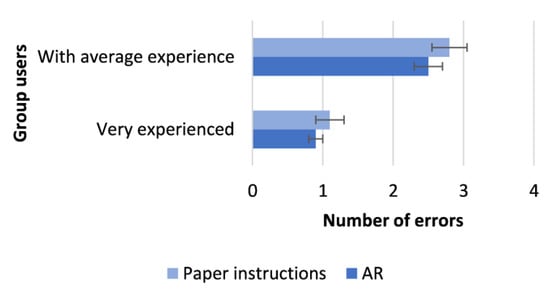 These workers were asked to perform six different assembly activities using both the traditional approach (hard-copy manuals for work instructions) and the AR application. Their performance corresponding to these two approaches was assessed and compared by exploiting the two following quantitative metrics: (1) the overall time taken to complete the task; (2) the number of errors made in the execution of the task (e.g., the use of the wrong component, incomplete assembly, or incorrectly assembled component). Therefore, during the experiment, these two metrics were monitored in both approaches (the AR solution and paper instructions), and the results of the average assembly times and the average of the generated errors are plotted in Figure 8 and Figure 9, respectively, leveraging the histograms. Each plotted histogram also represents the standard deviation. In this regard, it should be noted that the value of the standard deviation was in all cases rather low, and therefore the deviation of the various data from the average was always minimal.