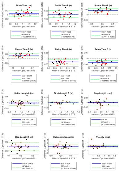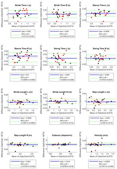 The OptoGait system showed high concurrent validity with the motion capture system based on a comparison of spatiotemporal gait parameters of 27 healthy children obtained through 3 different filter settings (1 LED, 2 LED, and 3 LED). The results on the ICCs confirmed the consistency of the two measures, showing excellent values in all cases, with the exception of moderate values for Swing Times, with 1 LED and 2 LED filter settings and good values for Stance Times with 1 LED and 2 LED configuration settings. Moreover, the NLoAs showed good agreement, confirming the OptoGait system as a sufficiently reliable and accurate tool. The results of the bias obtained were further confirmed as acceptable after comparison with the findings reported by Oeffinger et al. [33] on a cohort of children with cerebral palsy. For this purpose, a 5% value for the bias was empirically selected based on the physiotherapists’ experience. Thus, the experience-based threshold was further confirmed by comparison with the Minimum Clinically Important Difference (MCID) values obtained by Hallman-Cooper et al. [34]. Indeed, the authors calculated the MCID values on cadence, stride length, and velocity and presented them as the minimum percentage of the parameters allowed for having a clinically important difference. For all the parameters, the retrieved MCID was always a percentage higher than 5% (cadence: 8.1%, stride length: 5.8%, velocity: 9.1%), indicating coherence of our experience-based acceptability limits with a diagnostic application for one of the main causes of disability in children’s populations.