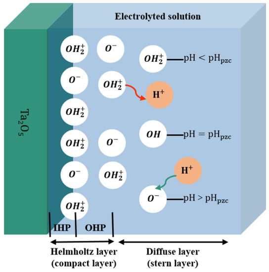 If the solution is alkaline, the H + will diffuse out of the layer and a negative charge will be generated on the outer side of the membrane. The reverse procedure will occur if the solution is acidic. More specifically, H + will diffuse into the layer and a positive charge will build up on the outer side of the membrane [30]. When the residual charge on the electrode’s surface is zero, the electrode potential is called a zero-charge potential and the pH value that corresponds to the zero-potential point is expressed as pHpzc [31]. The electric double layer effect is formed to maintain the electrical neutrality of the whole system. The reaction process of the Ta2O5 surface groups is represented by Equations (1) and (2), as follows: