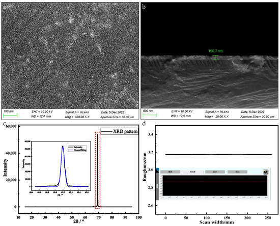 Figure 5. (a) SEM surface images of Ta2O5 film; (b) SEM cross-sectional thickness characterization of Ta2O5 layer: 150.7 nm; (c) XRD pattern analysis of the Ta element; (d) The average roughness of the Ta2O5 thin film.