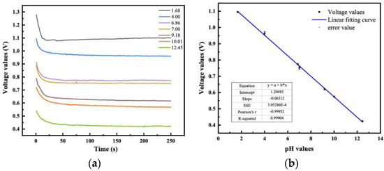 Figure 6. (a) Characteristics of response time tests in solutions at different pH values; (b) Linearity and sensitivity test of pH solutions from 2 to 12.