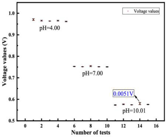 Under same working conditions, the variability of the acquired characteristic curves obtained by the continuous output change in the same direction within the entire measurement range is considered of vital significance. The repeatability of the sensor is verified by repeated testing of the sensor five times in a solution of pH values equal to 4.00, 7.00 and 10.01 at 1-min intervals. Repeatability refers to the relative standard deviation (RSD), calculated from the standard deviation and the mean of the test data, i.e., RSD is equal to the standard deviation divided by the mean. The average output curve of the repeatability test is shown in Figure 7. The maximum repeatability error is 5.29%, indicating that the pH value measurement is accurate and reliable. The drift effect refers to the slow non-random change of the output voltage of the signal electrode. The drift rate increases as the pH of the solution is increased from acidic to basic. The presence of hydroxide ions causes a higher drift in alkaline solutions than in acidic solutions. This can be observed from Figure 7, whereby the maximum drift voltage is 5.1 mV.