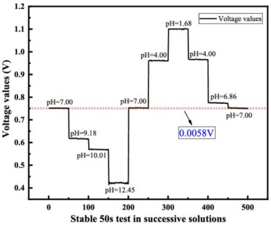 A parameter that measures sensor characteristics is also related to hysteresis effects. The hysteresis effect refers to the degree to which the output–input characteristic curves of the sensor do not overlap during the forward and reverse strokes. A small hysteresis voltage signifies more accurate sensing measurements. The sensor’s response is measured in the following order of pH values: 7.00, 9.18, 10.01, 12.45, 7.00, 4.00, 1.68, 4.00, 6.86, 7.00. The voltage values of 50 s after the output signal stabilization in different pH solutions are selected as a ladder, and the voltage difference between the first and last pH = 7.00 solution is used as the hysteresis voltage. As Figure 8 shows, the hysteresis voltage of the sensor is less than 5.8 mV when using the straight line of precise position control in Origin software. The hysteresis width of the Ta2O5 pH sensor strongly depends on the pH measurement loop and time of measurements, the surface area and the crystalline properties of the materials.