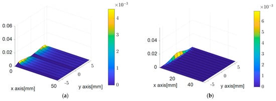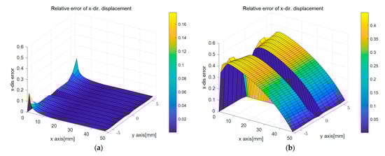 where error refers to the sup-norm error, representing the most significant value among each node’s calculated errors. The subscript ex denotes the exact solution, and PDM refers to the results calculated using the PDM. Figure 3a,b illustrates the relative errors in the x and y-directional displacements of the PDM nodes plotted as surface plots, respectively.