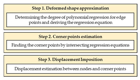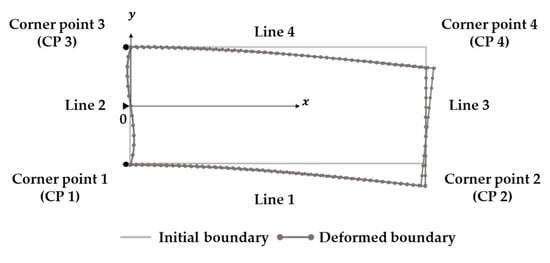 Among the PDM boundary nodes, corner points of a structure can be determined from the intersection points of regression equations without any additional assumptions. For example, in the case of a rectangle such as that in Figure 5, the x coordinates of the four corner points can be obtained from the intersection points of the regression equations with the same independent variables for the four edges. The y coordinates can then be obtained by substituting these values into the regression equations, determining the two-dimensional coordinates of the corner points after deformation. These values are then used as initial values for determining the essential boundary values of the PDM boundary nodes between the corner points in Figure 6, Step 3.