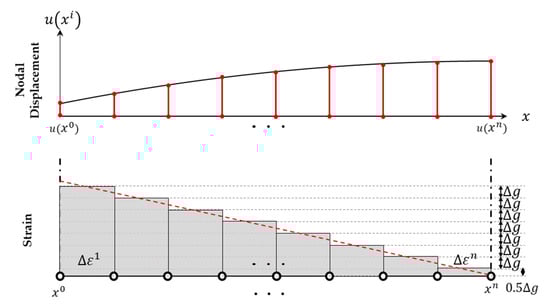 where the superscript denotes the number of the edge nodes, with the starting point as zero and the endpoint as n. The independent variables indicating the coordinates after deformation along the edge-axis at the ith edge node are denoted by , where the edge-axis coordinates of the PDM boundary node are and represents the edge-axis displacement determined through the displacement allocation function described later. In Step 3 of Figure 6, the displacement along the PDM boundary nodes is calculated through the edge-axis displacements and determined in Step 2. Although the relationship between the edge-axis displacement and is unknown, it is assumed to have a polynomial function relationship. This assumes a polynomial relationship between the pre-deformation and post-deformation; if this relationship is expected to be nonlinear, a higher-dimensional displacement mapping and tracking method would be implemented. This study assumes this variable is a quadratic function approximated as a cumulative sum of strain. Figure 7 illustrates the method of calculating the edge-axis displacement, assuming linear strain at an arbitrary position for the end values, and with zero strain at . To simplify computation, it is assumed that the strain is constant within a section divided into equal sizes, and the value at the center of the section is used.