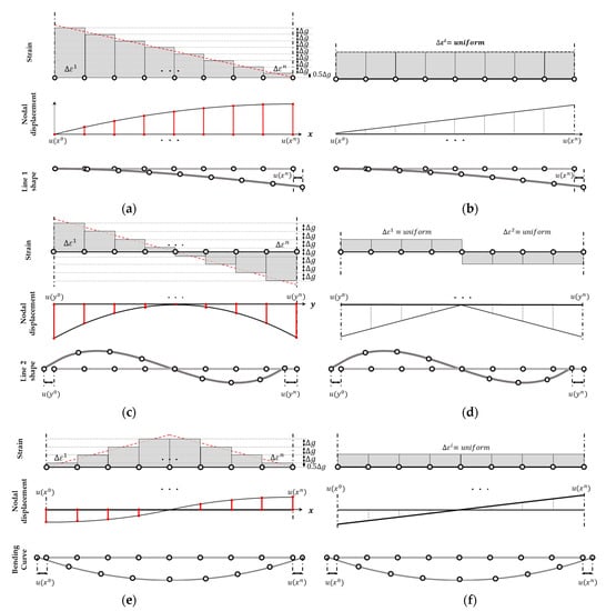 where is the edge-axis displacement over the entire interval, which is the difference between the end values and . Figure 8 illustrates the displacement and strain for the assumption of edge-axis displacement as a quadratic function (Figure 8a,c,e) and a linear function (Figure 8b,d,f). In the case of assuming a linear function including a bi-linear function, the magnitude of the edge-axis nodal displacement can be represented as a linear equation, as shown in Figure 8b,d,e. The resulting function depends on the regression independent variable (Equation (21)). The displacement in the direction perpendicular to the edge-axis of the analysis point is related to the degree of the regression equation. This approach is suitable for modeling cases where strain occurs uniformly, such as uniaxial tension, as it might assume constant strain.