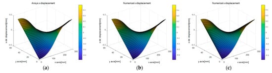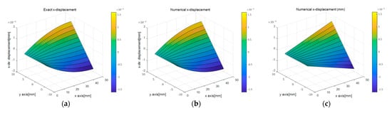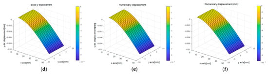 Figure 9b,c shows the surface plots of the x-directional displacement calculated by the PDM analysis for different displacement capturing methods. The results that were calculated assuming linear strain were similar to the exact solution, while those calculated using the uniform strain model displayed some differences. These differences arose because the edge-axis displacements determined by the two methods differed. However, as observed in Figure 9e,f, the trends of the y-directional displacement distributions were similar regardless of the degree of the regression function. However, variations in the values of the dependent variables due to differences in the independent variables resulted in variations in the values of the kinematic variables.
