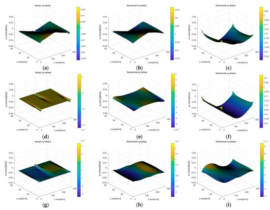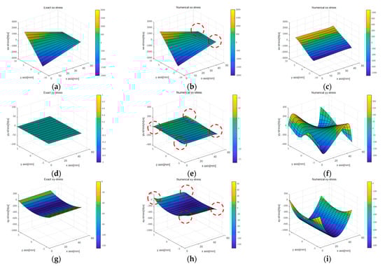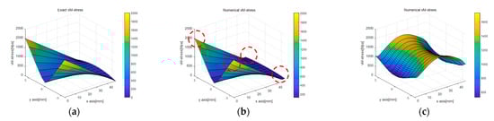 Figure 10 and Figure 11 compare the stress values calculated using the two displacement capturing methods with the analytic solution in Equation (17). In Figure 10, the application of the linear strain model for line 1 and line 4 resulted in some differences from the analytic solution, as indicated by the red dotted circles, but the differences were insignificant. Figure 10b,c presents the calculation results for , which were similar to the trends observed in the strain models of Figure 8a,b. The linear strain model provided displacement for the PDM node by accumulating a strain per section, resulting in stress resembling the strain distribution shown in Figure 8a. On the other hand, the uniform strain model considered a constant edge-axis strain, resulting in the calculation results shown in Figure 10c. In other words, the differences in the displacement capturing method associated with the regression method were linked to the differences in the stress calculation results.