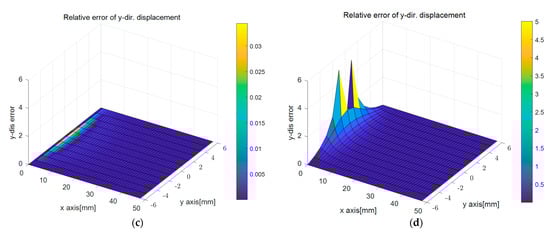 Figure 12 presents the surface plots of the relative sup-norm error of the displacement (Equation (18)) for the two displacement capturing methods. The results of applying the linear strain model in Figure 9a,c were similar to those in Figure 3, which was the traditional BVP analyzed using the PDM. However, the more significant error in the corner part of Figure 9a compared with Figure 3a was due to difficulty determining the corner points where the regression equations intersected. The errors primarily occurred around Corner Point 1 and Corner Point 3 in Figure 5, near the support of the cantilever beam, where the x-directional displacement was fixed. However, as the polynomial regression equations accurately approximated the deformed shape, the absolute value of the resulting error was not significant, and its impact was limited to the nodes near Corner Point 1 and Corner Point 3, as shown in Figure 12a. In contrast, for the uniform strain model presented in Figure 9b,d, the error magnitude at the corner points was smaller compared to other areas, but relatively much larger errors were observed in the middle part of the edge between corner points.