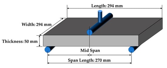 As shown in Figure 14, the supports of the 3-point bending beam were not located at the very end; however, this condition was not properly reflected in the analysis, which may introduce error factors in boundary modeling. To reduce these errors, the bottom surface of the analysis model can be divided into more sections to reflect such point conditions better. However, this study aimed to estimate the edge displacement as efficiently as possible, so only the conditions shown in Figure 8e were used.