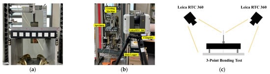 Experimental setup for acquiring PCD of a specimen in 3-point bending condition: (a) specimen setup; (b) device setup; (c) LiDAR device setup.