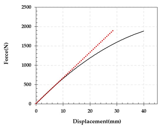 The rubber beam was subjected to displacement control, and LiDAR scans were performed at temporary stops every 2 mm stroke or deflection up to 20 mm and every 5 mm unit up to 40 mm. Figure 16 shows the load–displacement relationship for the loading test, where nonlinear behavior was observed owing to the nonlinearity of the rubber after the deformation became somewhat significant. The red dashed line represents the secant line when assuming a linear relationship between the displacement and load, indicating roughly the point up to which the rubber beam can be considered a linear-elastic body during the loading process. Since this study aimed to calculate kinematic variables of linear-elastic behavior, the BVP analysis was performed using the PCD of the deformed shape obtained when the deflection was 2 mm, which may guarantee the small deformation of the rubber beam.