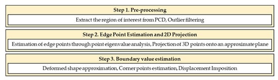 Figure 18 shows the process of estimating boundary condition values for the PDM analysis from the acquired PCD through the.ply file format. The processing was conducted using Open3D 0.16.0 [36] and SciPy 1.7.3 [37] libraries in the Python environment. Step 1 involved refining the initial PCD for the region of interest, i.e., the analysis target surface, and filtering out outliers. The results of this process are shown in Figure 19a,b. Edge points were extracted from the primary processed PCD using a method that estimated edge points through the surface variation of an arbitrary point [38], as described in [30]. This method is most suitable for estimating sharp edges, but it was applied in this study because it is easy to implement, and the processing speed is high. The fundamental principle of this method is to estimate points with surface variation () close to zero in the PCD as edges using the eigenvalues (, , of the k nearest neighbors of an arbitrary point. The surface variation is calculated using Equation (32).