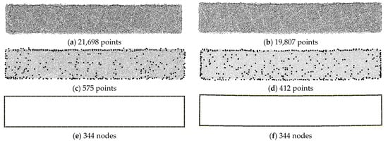 The edge points obtained after the processing were still represented in 3D coordinates. Therefore, to obtain a 2D PCD, the 3D edge points were projected onto the analysis plane, as shown in Figure 19c,d. The points estimated within the analysis plane contained errors owing to the different laser reflection characteristics of the marks used to confirm the specimen deformation, which was appropriately removed visually. Step 3 of Figure 18 follows the process explained in Figure 6, and the results are shown in Figure 19e,f. In this study, the essential boundary node and independent variable of the regression equation were directly connected to assign the essential boundary condition for the PDM model. When the PDM node interval was set to 2 mm, the number of PDM boundary nodes was determined to be 344, as shown in Figure 19e,f. This method can assign essential boundary values to PDM boundary nodes from the pre and post-deformation PCD of structures without attached targets.