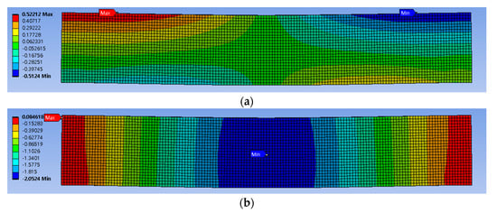 Deformed shape and contour plot for x and y displacements obtained by ANSYS analysis (the first analysis method): (a) -directional displacement obtained by ANSYS analysis (the first analysis method); (b) -directional displacement obtained by ANSYS analysis model.