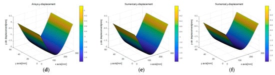 Comparison of directional displacement according to different displacement capturing methods in elastic beam analysis using the PDM-based BVP approach: (a) analytic ; (b) linear ; (c) uniform ; (d) analytic ; (e) linear ; (f) uniform .
