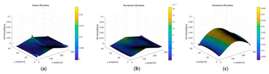 Comparison of the computation results of von Mises stress computed by different displacement capturing methods and simulation methods in 3-point beam bending analysis: (a) von Mises stress (only ANSYS); (b) von Mises stress (linear strain, PDM analysis based on ANSYS simulation deformed shape); (c) von Mises stress (linear strain, PDM analysis based on deformed shape derived from PCD regression processing).
