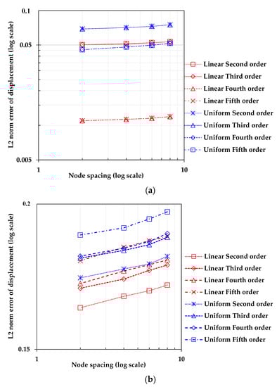 where Ω refers to the problem domain, represents the displacement vector calculated from the PDM analysis results, and refers to the displacement vector following the closed-form solution in Equations (15) and (16). The convergence study depicted in Figure 4 demonstrates the rates in the error norm as the node spacing of the model, which is distributed at regular intervals, decreases. As anticipated, it is observed that the PDM BVP analysis algorithm performs with high accuracy as the number of analysis nodes increases. This indicates that if the essential boundary conditions for the structural boundaries are correctly provided, the stress inside the structure can be precisely calculated using the PDM.