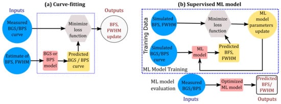 - Data Processing Time: The computational advantage of the ML approach over the CF approach is evident when comparing the schematics of both approaches, as shown in Figure 2. The CF approach requires repeating the optimization iterations for each BGS, while the ML approach can predict the BFS and FWHM directly from the BGS measurements using Equation (7), once the ML model is trained offline.