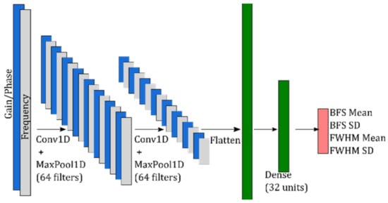 A deep neural network (DNN) with a combination of convolutional and dense layers is chosen to represent in Equation (11). It is evident from Equations (10) and (11) that the outputs of the DNN are the means and standard deviations of BFS and FWHM. Consequently, the DNN will henceforth be known as a probabilistic deep neural network (PDNN). The PDNN was programmed in Python and the code is available in Code 1 [41]. This PML framework can be easily implemented with another ML or DNN model with minor modifications in the code.