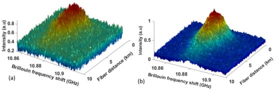 A distributed feedback (DFB) laser with a wavelength of 1550 nm was used as a laser source. The laser output signal was split into two branches using a 50/50 3 dB fiber coupler. One branch was for generating input pump pulses and the other branch was for the probe signal to make stimulated Brillouin operation over the fiber distance. A Mach–Zehnder modulator (MZM-1) was used to modulate the optical pulses using a pulse generator. The pulse peak-to-peak amplitude set at 4 Vpp, and the pulse width was set at 10 ns, corresponding to 1 m spatial resolution, whereas the pulse repetition frequency was 4 kHz, which has enough round-trip time to travel the full length of the fiber. In order to compensate the high lossy operation of MZM modulators, a polarization controller (PC) was employed at the input of each MZM to alter the polarization state of the signal and to reach maximum optical power after both MZMs. The output signal was then amplified using an erbium-doped fiber amplifier (EDFA-1). A narrow band-pass filter bandwidth: 0.8 nm was employed to reduce the amplified spontaneous emission (ASE) noise originating from the EDFA. To avoid polarization noise due to the intense polarization sensitivity of the stimulated Brillouin scattering mechanism, a high-speed polarization scrambler (PS) was used to reduce the polarization dependence of Brillouin spectra. The second MZM (MZM-2) was modulated with a frequency close to the BFS of the sensing fiber (10.82 GHz) via an external RF synthesizer. The signal was amplified by EDFA-2 and then sent to an isolator, which allows signal transmission in one direction. The input pump peak power (20 dBm) and the counter-propagating probe power (6 dBm) were sent to the fiber under test. The stimulated Brillouin signal from the circulator (CIR) port 3 was amplified using EDFA-3 and sent to ASE filter-3 to remove the ASE noise. Thereafter, the signal was detected using a photodetector (PD, bandwidth: 125 MHz) and analyzed with a vector network analyzer. In order to obtain the BGS spectra over the fiber distance, the RF synthesizer frequencies were swept around fiber under test BFS, which were 10.78 GHz to 10.9 GHz with a frequency step of 1 MHz. The RF synthesizer and pulse generator were synchronized with the vector network analyzer. For the fiber under test, we used two different lengths of sensing fibers, 10 km and 25 km, and obtained 3D BGS specta over the sensing fiber distance at various trace averages. The sensing fiber was kept at room temperature and under strain-free condition throughout all the measurements.