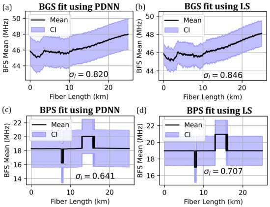 The mean BFS (computed with respect to 10.8 GHz) is predicted using the PDNN model over the entire fiber length from the BGS and BPS spectra and is plotted with (99.7%) confidence intervals in Figure 9a,c. These predictions are compared with a least-squares (LS) Lorentzian curve fitting model, as shown in Figure 9b,d. FWHM predictions from both models are shown in Figure 10.