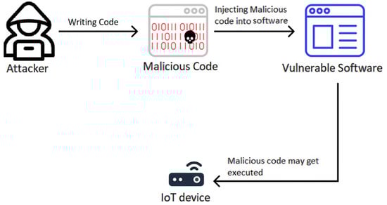 The repercussions of IoT device attacks have been demonstrated in several notable instances, which have resulted in significant financial and operational losses. One of the most infamous IoT attacks was the Mirai botnet attack in 2016. The Mirai botnet malware targeted online consumer devices such as IP cameras and home routers. The malware transformed these devices into a network of bots, which was then used to launch a massive Distributed Denial of Service (DDoS) attack on the Domain Name System (DNS) provider Dyn []. This attack temporarily shut down several major websites, including Twitter, Netflix, Reddit, and CNN. The financial impact of this attack was substantial, with Dyn reportedly losing around $110 million in revenue [,]. In the healthcare industry, a different kind of IoT vulnerability was exposed when St. Jude Medical’s cardiac devices were found to have security flaws that could allow hackers to deplete the battery or administer incorrect pacing or shocks. This led to a recall of approximately 465,000 devices []. The financial loss was significant, not only due to the recall but also because of the damage to the company’s reputation and subsequent legal costs. The automotive industry has also been affected by IoT security issues. A vulnerability in the Jeep Cherokee’s entertainment system allowed hackers to take control of the vehicle remotely. This led to a recall of 1.4 million vehicles by Fiat Chrysler []. The financial loss from this incident, including the recall costs and the impact on the brand’s reputation, was estimated to be hundreds of millions of dollars. These examples underscore the potential severity of IoT attacks in terms of financial loss and broader impacts on operations and reputation. As IoT devices continue to thrive, it is crucial to prioritize security measures to mitigate these risks. Code injection attacks are one such example that can severely threaten the proper functioning of both wired and wireless networks and hence the proper functioning of IoT applications and devices [,,].