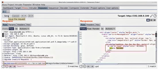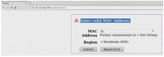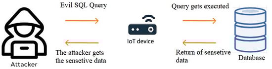 In the early 2000s, SQL injection attacks became a significant threat to web applications, with high-profile attacks such as the 2005 breach of the credit card processing company “CardSystems Solutions” highlighting the potential for SQL injection attacks to cause severe financial harm []. One of the most known examples of SQL injections query that can bypass authentication forms is the one line: “‘or’ 1‘=’1” which can also be manipulated in any other syntax that returns a true value of a condition. Figure 3 illustrates the SQL injection attack procedure on a vulnerable application running on an IoT device.