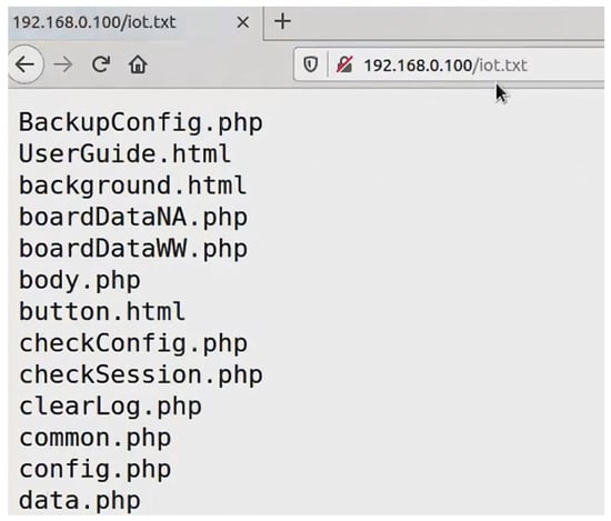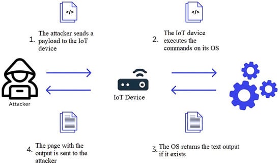 - Remote command injection: This type of attack involves injecting malicious commands into a remote system, such as a lightweight webserver hosted on an IoT device, through a vulnerability in the network or the application [].