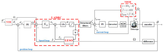 Because the servo systems for the azimuth and elevation axes of a telescope are independent of each other, in this study, the elevation axis of a telescope was considered as an example. Figure 1 shows the diagram of a typical telescope servo control system, which is mainly composed of a position loop, a speed loop, a current loop, an inverter, a PMSM, and the telescope. The transition process of the position loop is based on the improved nonlinear tracking differentiator (NTD), which generates the reference position and velocity according to the maximum speed and acceleration allowed by the telescope. The smoothed position reference is used as the new command, and the speed reference is used to feedforward speed. The linear active disturbance rejection control (LADRC) is used on the speed loop, and the linear extended state observer (LESO) estimates and compensates the disturbance. Moreover, the conventional proportional integral (PI) control is used on the current loop. Although the use of acceleration information can improve the tracking performance of the telescope, a high-precision acceleration sensor is expensive and requires high installation accuracy. Therefore, to improve the servo performance without an acceleration sensor, an NDOB is designed to estimate and compensate for the disturbance. Since the NDOB compensates for most of the disturbance through feedforward q-axis current command, the LESO only needs to estimate the residual disturbance on the outer speed loop. The ADRC + NDOB method has a better anti-disturbance performance, and therefore the speed loop can achieve higher low-speed tracking precision under disturbances. Because the control bandwidth of the speed loop is limited by the resonant frequency of the telescope, the design of the structural filter is necessary, for which the reader is referred to [31], as it is not covered here.